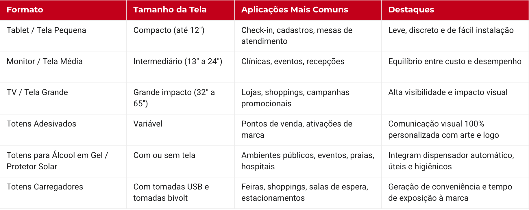 Cada modelo de totem foi criado para atender a uma necessidade diferente. Veja o comparativo atualizado com os principais tipos disponíveis na MDA Totem: